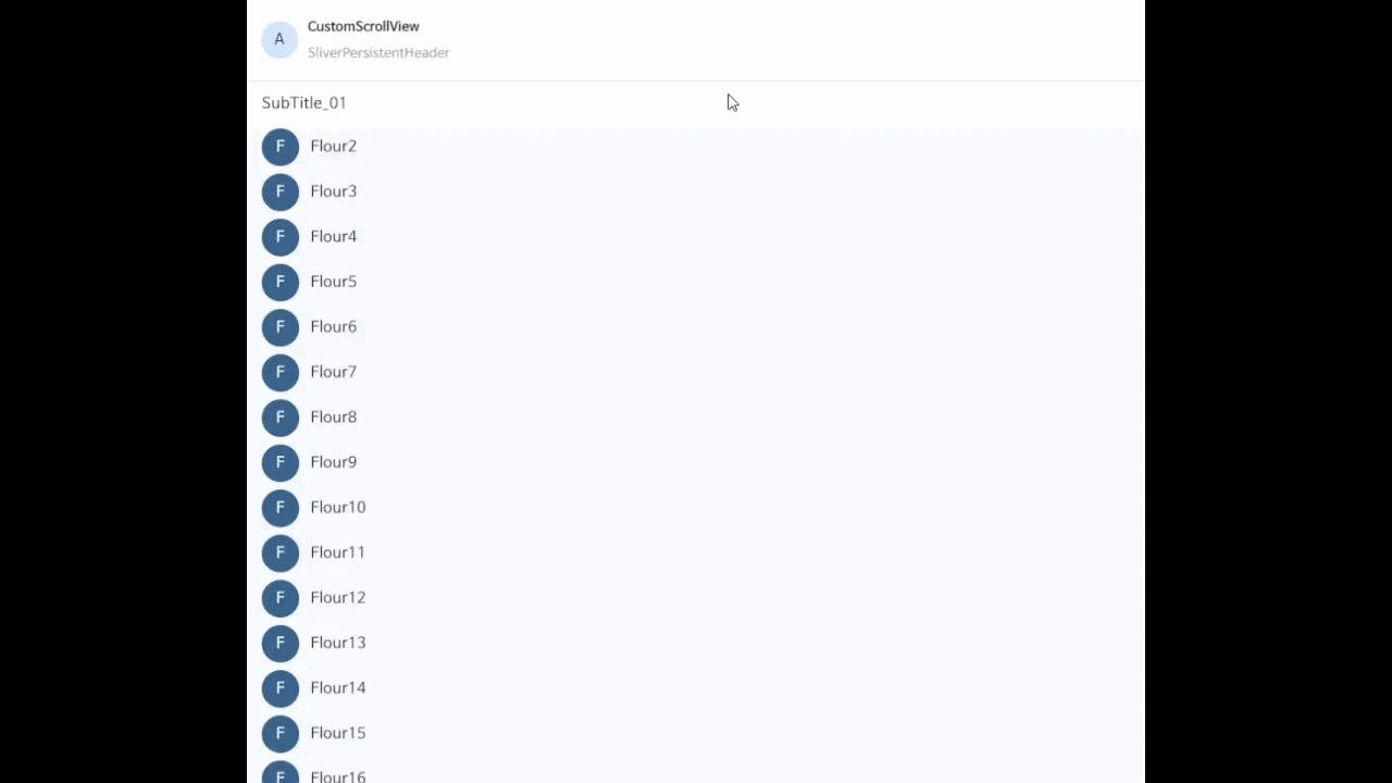 SliverPersistentHeader는 스크롤 될 때 ScrollView 상단에서 고정되는걸 볼 수 있다.