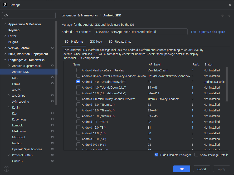 Settings > Languages & Frameworks > Android SDK 설정 화면으로 이동