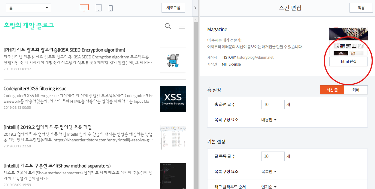 그러면 스킨 편집창 오른쪽 영역이 HTML 편집기로 바뀝니다.