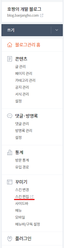 좌측 메뉴 중에서 '스킨편집'을 클릭합니다.