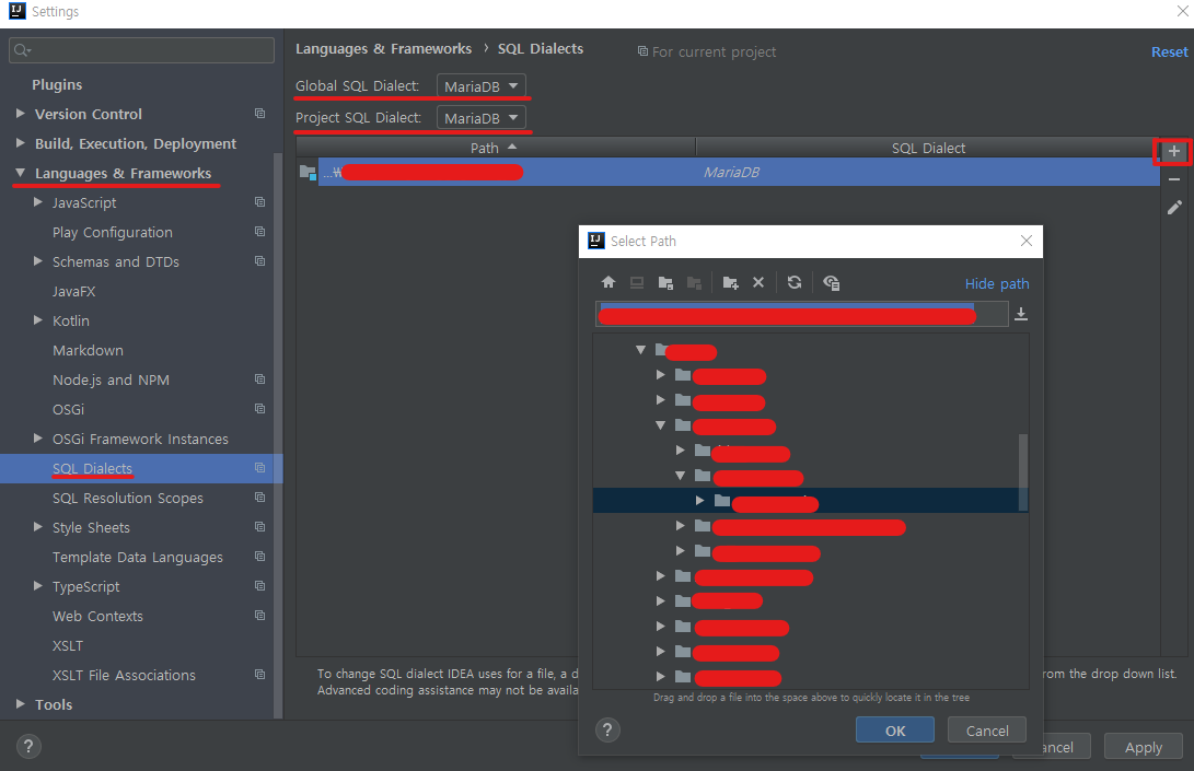 File > Settings 또는 Ctrl + Alt + S를 눌러서 Settings 창을 열고, 좌측메뉴 Languages & Frameworks > SQL Dialects 메뉴에서 사용중은 Database를 지정해주면된다.